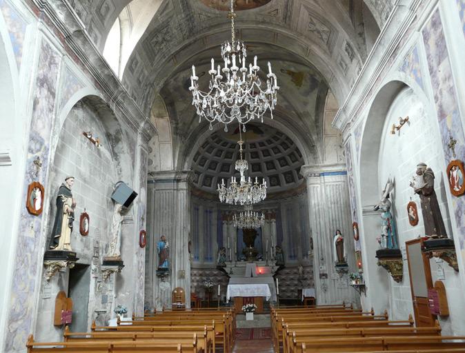 Edifice de plan allongé formé d'une nef à vaisseau central et à chapelles latérales voûtées en berceau à lunettes. Le choeur est formé d'une première travée droite voûtée en berceau prolongée par une abside voûtée en cul-de-four. Tour-clocher à la chambre des cloches à baies libres cintrées, sommée d'un lanternon couronné d'un dôme.