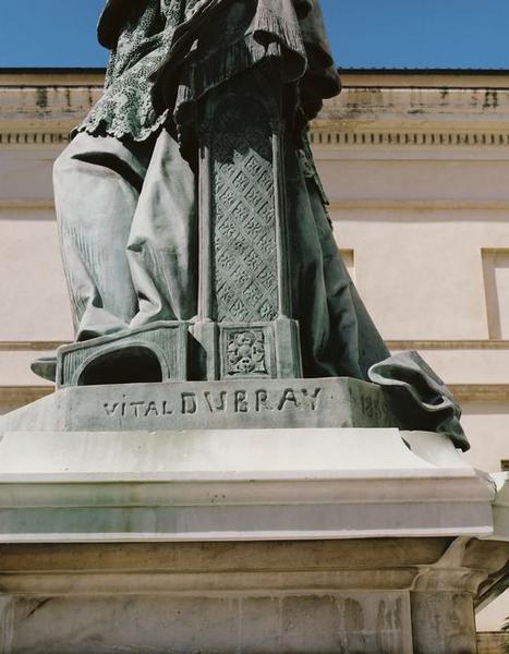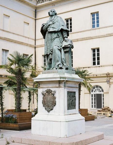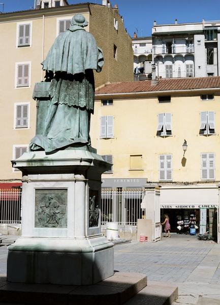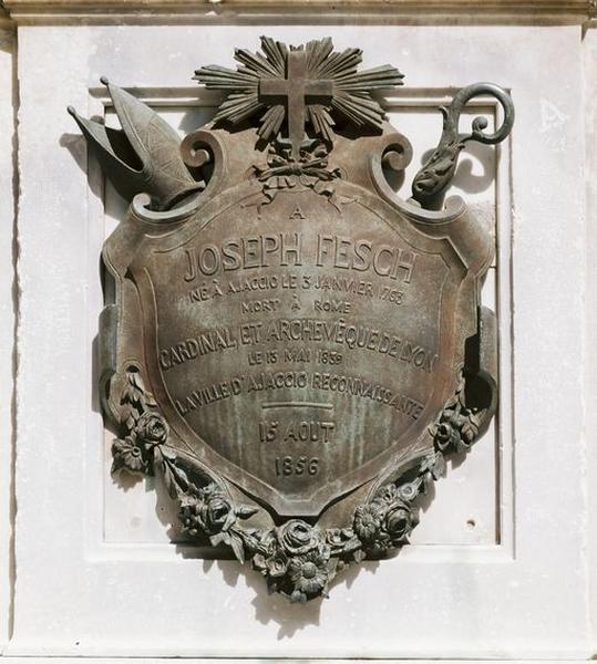 Monument commémoratif du cardinal Fesch, érigé en 1856 sur les plans de l'architecte Jérôme Maglioli, à la demande de la ville d'Ajaccio, complété d'une statue du cardinal et de bas-reliefs sculptés par Vital-Gabriel Dubray (1813-1892) et fondus en bronze. Par décret impérial en date du 23 mai 1854, la ville d'Ajaccio est autorisée à élever un monument en l'honneur de son Eminence le cardinal Fesch. Le 8 août 1854, le conseil municipal vote la somme de quarante mille francs pour faire face aux dépenses en résultant. Mais, en l'absence de ressources communales suffisantes, la nécessité d'un recours à un emprunt à la Caisse des Dépôts et Consignations s'impose. Pour ce faire, le maire sollicite l'accord du préfet. En février 1855, deux esquisses de la statue devant sommer le monument, sont adressées au maire par "Monsieur l'architecte de Paris". Le devis relatif à la construction du piédestal, proposé par Jérôme Maglioli, s'élève à la somme de six mille francs. L'architecte a du, par la suite, modifier le plan originel pour suivre les indications de Vital-Dubray. La réalisation de ce piédestal est adjugée au marbrier Joseph Luciani pour la somme de 6 000 francs payables en trois termes. Enfin, au cours de la séance extraordinaire du conseil municipal du 12 avril 1855, le maire est autorisé à traiter avec M. Dubray, sculpteur à Paris, pour la fourniture de la statue du cardinal Fesch en bronze avec écusson et trois bas-reliefs, pour un coût de vingt mille francs, à valoir sur le crédit de quarante mille francs voté par délibération du 18 août 1854. En ce qui concerne les bas-reliefs, le sculpteur a du se conformer à la volonté du conseil municipal, lequel lui a donné des directives très précises : face postérieure opposée à l'écusson, sacre du cardinal comme archevêque de Lyon ; une des faces latérales, fondations des écoles chrétiennes (frères et soeurs de St Joseph) ; l'autre face latérale : le cardinal protecteur des Beaux-Arts (sculpture et peinture). Vital Dubray fait remarquer que la face postérieure pour laquelle un bas-relief est souhaité "est ordinairement la place réservée pour une inscription indiquant l'année, le règne ou présence de quelle autorité". Inaugurée le 15 août 1856, la statue ne répond pas aux attentes des conseillers municipaux qui regrettent de ne pas y trouver de ressemblance avec le cardinal. Six jours plus tard, sur convocation du conseil municipal, Vital-Dubray est invité à se justifier. Il explique alors qu'il s'est attaché la collaboration du peintre Jules Pasqualini qui a bien connu le prélat pour avoir entamé sa carrière sous sa protection. Né à Ajaccio en 1763, Joseph Fesch est le demi-frère de Letizia Ramolino, mère de Napoléon Ier. Archevêque de Lyon et primat des Gaules, il est nommé cardinal en 1803. Profondément attaché à sa ville natale, le cardinal Fesch crée à Ajaccio un "Grand établissement d'études" (actuel Palais Fesch). Véritable homme de bien, il a fait oeuvre de bienfaisance auprès des classes populaires ajacciennes, et c'est à ce titre que la ville d'Ajaccio souhaite honorer sa mémoire sous le second Empire.