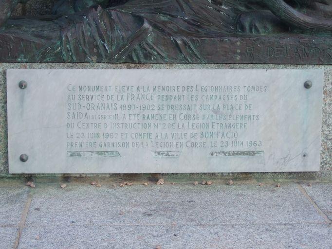 En 1908, le sculpteur normand Robert Delandre réalise un monument aux morts pour la ville de Saïda en Algérie. Il est destiné à rendre hommage à tous les morts des unités ayant participé à la conquête de l'Algérie : Spahis, Chasseurs, Zouaves, Légionnaires, Tirailleurs. Lorsque la décision fut prise d'installer la Légion en Corse, c'est l'unité de la Légion en garnison à Saïda, qui démonta le monument afin de le ramener à Bonifacio, en 1962. La municipalité conduite par Don-Mathieu Tramoni, avait pour charge d'aménager une place pour l'installation de l'oeuvre. L'entreprise Brunelli réalisa le socle en granite. Après le départ définitif de la Légion, en novembre 1983, le monument est confié à la commune.