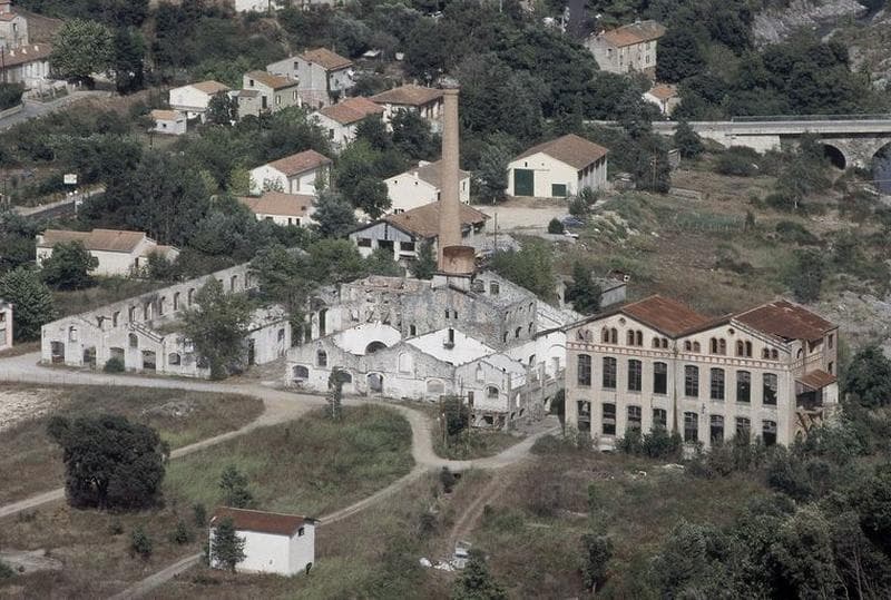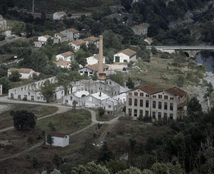 scierie ; tonnellerie ; usine de papeterie ; bassin de décantation ; bureau d'entreprise ; cheminée d'usine ; canal