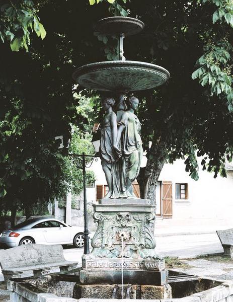 Fontaine en fonte de fer ornée de mascarons et du groupe sculpté des Trois Grâces surmonté de deux vasques. Entourée d'un bassin de fontaine maçonné.