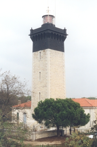 - Description architecturale : £Hauteur au dessus de la mer : 26, 85 m.£Taille générale : 27, 40 m.£Hauteur de la focale : 25, 25 m.£Description : Tour carrée en maçonnerie de pierres apparentes avec chaînes d'angle en pierres apparentes accolée à la façade Est d'un bâtiment rectangulaire en maçonnerie lisse avec chaînes d'angle en pierres apparentes. Encorbellement par consoles assemblées par des arcs supportant une balustrade de pierre. Haut du phare peint en noir en 1907. Cour intérieure fermée par un bâtiment rectangulaire abritant les magasins. Logements, garages, annexes. Terrain clôturé.£- Description technique : £1ère optique : 01 janvier 1869 : feu fixe varié par des éclats de 4 minutes en 4 minutes de 3 ème ordre dioptrique, focale 0, 50 m.£Autres optiques : 20 octobre 1907 : feu à 3 éclat blancs toutes les 15 secondes, focale 0, 50 m, lentille de 6 panneaux au 1/6.BBT.£Cuve à mercure : 1907.£Combustibles : £Huile végétale : 1869.£Huile minérale : vers 1875.£Vapeur pétrole : 1907.£Automatisation : 1980.£- Etat actuel : Tour carrée centrée à la façade d'un bâtiment rectangulaire, le tout en maçonnerie de pierres apparentes et chaînes d'angle. Haut du phare peint en noir. Cour intérieure, puits, logements, garage. Terrain. Lanterne Ø 2, 40 m à 10 pans à 2 niveaux de vitrage cylindrique sur une murette maçonnée. Optique focale 0, 25 m de 2x3 éclats groupés à montants métalliques, repérée BBT. Cuve repérée Sautter Harlé Ø 0, 66 m Ebor 2300. Lampe halo 1000w. Feu tournant à 3 éclats groupés 12sec. Portée 24 milles.