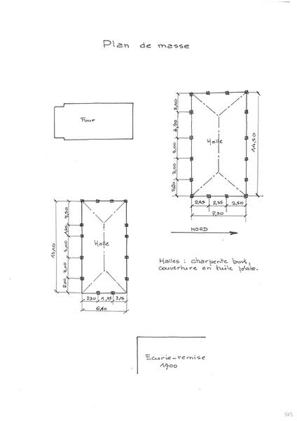 Four à feu intermittent et flammes longues. La chambre d'une capacité brute de l'ordre de 50 m3, permettait la cuisson de tuiles, briques et carreaux ; tandis que le four du 18e siècle, qui était imposé pour une capacité de 15 m3 cuisait également de la chaux, et ce moins de 8 fois l'an. La matière première était tirée à 600/700 m au Nord du four. Four couché de 11 X 5 m et 1, 95 de hauteur à la retombée de voûte, avec chambre de cuisson de 6, 50 X 2, 55 m. L'embrasure du foyer est ouverte au Sud et celle de chargement au Nord. Le foyer est à 2 bouches. Les bâtiments des 19e et 20e siècles demeurent, notamment les 2 halles, respectivement de 13, 10 X 6, 25 m à l'Est, et 14, 50 X 7, 30 m au Nord. Forme des baies : embrasure foyer, arc segmentaire ; plein cintre ; voûte de la chambre en anse de panier. Le site était desservi par une voie particulière. La surface totale était de 1 562 m². La surface bâtie était de 350 m². Le site était équipé d'une presse à bras dans les années 1870.