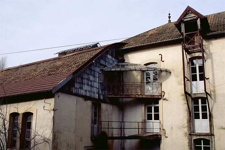 Logement patronal : moellons calcaires enduits, étage de soubassement, rez-de-chaussée surélevé, étage carré, étage de comble, toit à longs pans brisés et demi-croupes. Entrepôt industriel : pan de bois hourdé de briques de mâchefer, toit à longs pans. Atelier de fabrication : moellons calcaires, enduit, étage de soubassement, 2 étages carrés et étage en surcroît, toit à demi-croupes et tuiles mécaniques.