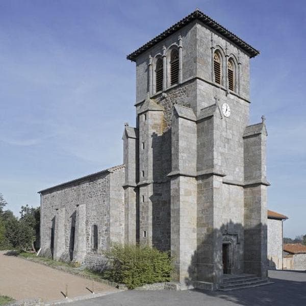 L'église forme un rectangle divisé en trois vaisseaux, une nef flanquée de collatéraux plus étroits, de trois travées. La nef est prolongée à l'est par une abside semi-circulaire dans l'axe de laquelle est construite une sacristie de plan carré. A l'ouest le clocher forme une travée d'avant-nef, avec un portail ouvert à l'ouest et une porte latérale au sud. En demi-hors-oeuvre dans le mur nord est logé l'escalier d'accès au clocher, en vis, qui fait saillie à la fois du côté extérieur, dans un massif demi-hexagonal, et vers l'intérieur, en arrondi au-dessus de sa porte d'accès. L'édifice est construit en moellon de granite ; le clocher est en partie en pierre de taille : façade ouest, contreforts, ensemble du dernier niveau, partie du premier niveau côté nord. Le portail a un linteau en arc déprimé surmonté d'un arc en accolade reposant sur des colonnettes, le tout abrité par un bandeau mouluré formant une accolade puis des retours à angle droit. L'étage des cloches est ouvert de fenêtres géminées en arc brisé, séparées par des pilastres surmontés de pinacles à crochets, et avec une gargouille en forme de protomé d'animal au-dessous du pilastre central. Les contreforts s'achèvent en bâtière, avec une croix de section octogonale pour ceux de la façade occidentale et un fleuron cruciforme pour ceux des façades latérales. Le toit en demi pyramide de l'escalier et surmonté d'un pinacle avec un écusson armorié à la base (armes des Bourbons). L'intérieur est voûté d'arêtes avec arcs doubleaux en plein cintre reposant sur des piliers de plan carré, sans dosserets contre les murs latéraux. La travée sous le clocher est voûtée d'ogives, avec une clef de voûte sculptée. L'abside est voûtée en cul-de-four. Une porte axiale permet de passer de l'abside dans la sacristie. Les fenêtres sont à une lancette en plein cintre. Les toitures sont en tuile creuse, à longs pans (nef et collatéraux) , en croupe ronde (abside) , en appentis (sacristie) ou en pavillon (clocher).