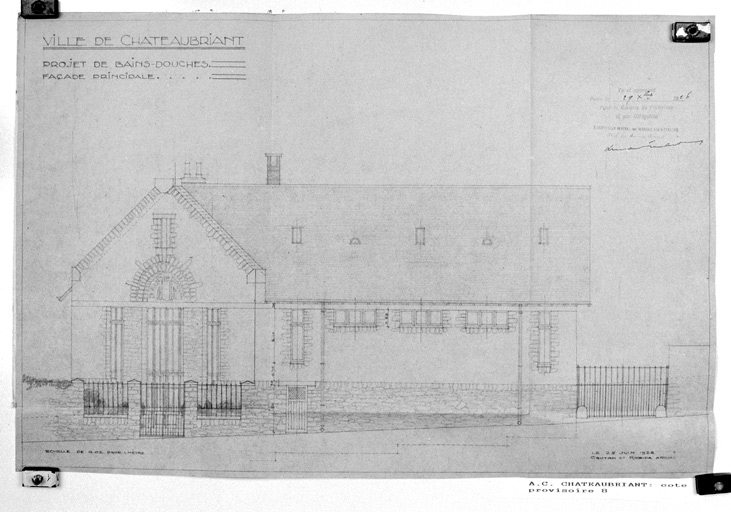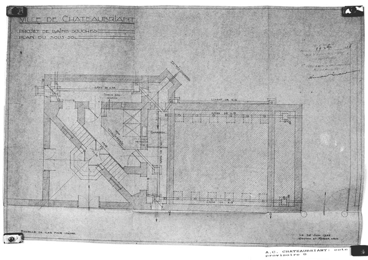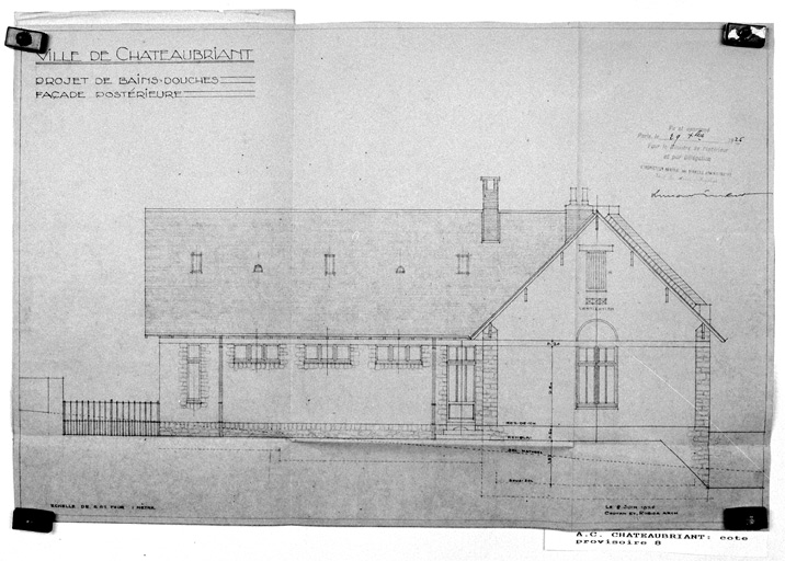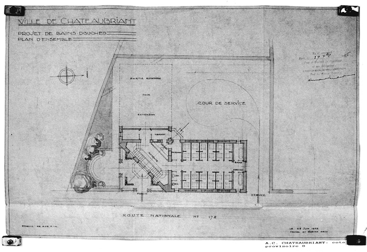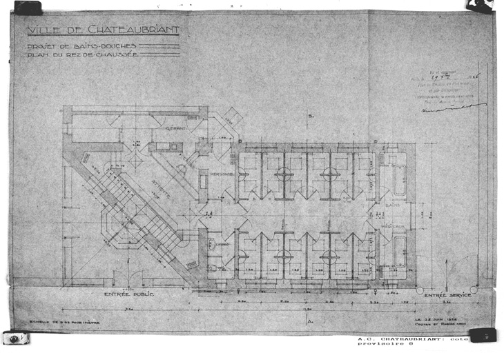 Edifice composé d'un corps antérieur dont le pignon de la façade est découvert, de plan triangulaire, où sont aménagées la salle d'attente et la caisse, et d'un corps rectangulaire postérieur où se trouvent les cabines de douches ; les deux corps sont couverts d'un toit à deux versants qui forment une noue à leur rencontre ; les assises de soubassement, les entourages de baies ainsi que la partie centrale de l'élévation antérieure sont en moellon ; les autres parties des murs sont appareillés en pierre artificielle et recouvertes d'un enduit ; sur les faces antérieure et gauche, court un bandeau de béton servant en même temps de linteau aux baies de l'élévation antérieure
