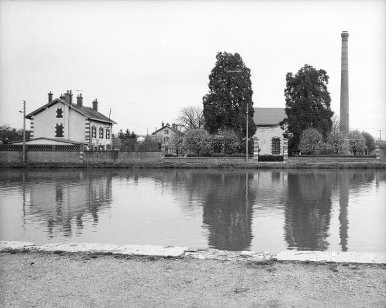 rigole ; pont aqueduc ; pont mobile ; cheminée d'usine ; salle des machines ; logement ; gare d'eau ; aqueduc ; jardin d'agrément