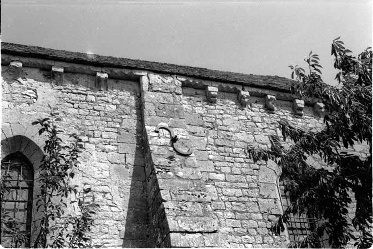 Eglise de forme rectangulaire ; chevet plat ; clocher en pierre ; portail plein cintre composé de deux archivoltes ; voûte du choeur en pierre. Modillons.