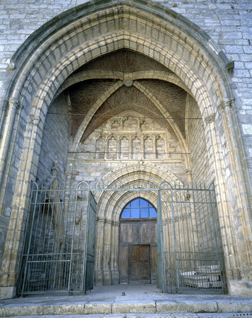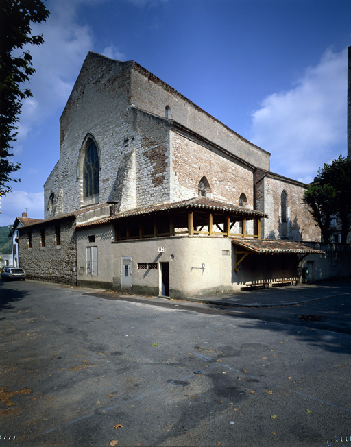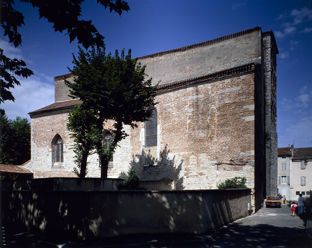 L'église Saint-Barthélemy s'élève à l'extrémité nord du faubourg des Soubirous, en bordure de la rue qui prolonge l'axe principal de la ville du Moyen Age. Elle n'est pas orientée, mais disposée nord-sud, avec un porche placé à l'est, sur la rue. L'édifice du 14e siècle est en pierre de taille, à l'exception de la tour-clocher établie sur le porche, qui est majoritairement en brique. La nef unique est bordée de chapelles à l'ouest comme à l'est, et elle s'achève au nord sur un mur de fermeture érigé dans l'attente de la construction du choeur, qui n'a jamais été réalisée. L'édifice est entièrement voûté d'ogives, à tores à listel pour les années 1320-1340, puis à nervures seulement chanfreinées.£Le porche, de la même profondeur que les chapelles, abrite un enfeu architecturé à gable et pinacles dont le destinataire n'est pas connu. Il précède le portail à voussures multiples, surmonté de deux registres d'arcature trilobées aveugles et accompagné, à gauche d'un dais sous lequel devait prendre place une statue.La première chapelle orientale possède également un enfeu architecturé et peint, dont les armoiries sont malheureusement aujourd'hui illisibles.