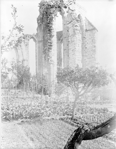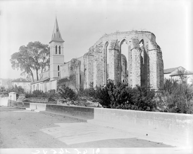Peu après le pont de Cabessut, en bordure de la rue des Jacobins, les ruines du chevet, malheureusement envahies par la végétation, donnent une première idée des dimensions de l'ancienne église des dominicains. L'abside polygonale et la partie droite qui la précède sont épaulées par des contreforts entre lesquelles ouvrent de très hautes fenêtres qui ont conservé quelques vestiges de leurs réseaux de pierre. Si les parements extérieurs sont en pierre de taille, les élévations intérieures sont en brique ; on y distingue encore les arrachements des voûtes.£La grande brèche entre le chevet et la nef en partie réoccupée par l'église paroissiale correspond au transept. Un escalier pris sur l'épaisseur du mur ouest du bras nord donnait sans doute accès au clocher. La première travée de la nef, avant le mur de fermeture de l'église paroissiale, montre des traces d'arcs formerets antérieurs à la construction du transept, et qui sont donc les vestiges les plus évidents de la première église.£La nef avait au moins deux travées de plus vers l'ouest, et comptait donc un minimum de sept travées bordées de chapelles, au nord comme au sud, toutes voûtées d'ogives. La moindre profondeur des chapelles nord tient sans doute à la présence des bâtiments conventuels. Deux de leurs voûtes se sont affaissées et ont dû être étayées à la suite de la suppression, dans les années 1970, des murs qui séparaient les chapelles, et qu'il faudrait aujourd'hui rétablir. Les maçonneries mises à nu montrent plusieurs phases de reprises dont l'analyse archéologique serait nécessaire à la compréhension de l'évolution de l'édifice.£Des bâtiments conventuels du Moyen Age ne semble subsister que les vestiges de la chapelle de la salle du chapitre, en partie reconstruite au 19e siècle et largement dénaturée par les aménagements des années 1970.