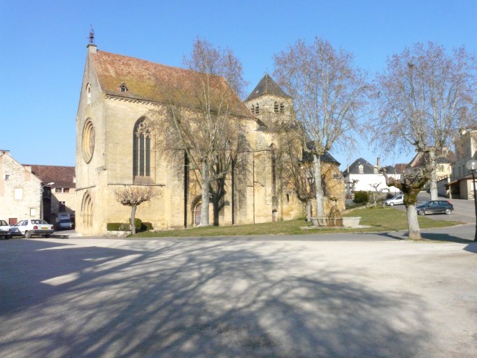 L'église se trouve aujourd'hui isolée au centre du bourg, après la démolition au 19e siècle de la quasi totalité des bâtiments du monastère, la documentation identifiant encore à cette époque le grenier et le cuvier du chapitre, la grange du doyenné, la maîtrise et, au nord-ouest, l'Ouvrerie, le seul à avoir en partie subsisté. L'ensemble formait un polygone entouré d'un fossé déjà mentionné en 1280.£La reconstruction de l'église au 13e siècle a dû tenir compte des bâtiments environnants, mais c'est peut-être la difficulté d'établir les fondations (dont la faiblesse a imposé d'importants travaux au 20e siècle) qui est à l'origine du fort désaxement de la nef par rapport au chevet : on a pu choisir d'implanter les parties orientales en utilisant, outre le rocher, les fondations préexistantes de l'église du 11e siècle, dont la base de la façade a été retrouvée en 1953 au milieu de la nef actuelle.£Le plan du chevet est exceptionnel. Il se compose d'une abside et de deux absidioles polygonales précédées chacune d'une travée droite dont l'ensemble forme une sorte de transept sur lequel ouvrent deux chapelles de plan hexagonal irrégulier. La liaison avec la nef plus étroite est assurée par deux espaces triangulaires dont les voûtes sont à la même hauteur que celles de la nef, définissant de ce fait une travée orientale à pans coupés qui reprend, sur une échelle plus large, le plan de l'abside (C. Freigang, op. cit., p. 528). A la multiplication et l'étagement des masses du chevet répond le fractionnement intérieur des volumes, accentué par les arcs doubleaux et la multiplication des supports. La nef a en revanche été conçue comme un grand volume unique, en dépit du puissant doubleau occidental. Un portail ouvre au nord dans la travée orientale de la nef, un autre au sud dans la deuxième travée. A l'ouest, le portail est surmonté d'une grande rose à réseau.£Des ruptures d'assises sont visibles dans les chapelles, dans les murs obliques entre le chevet et la nef et dans les murs de la nef. Les premières, si elles marquent des étapes dans la construction, ne signalent sans doute pas des interruptions significatives du chantier ; en revanche, celles de la nef correspondent à un changement de parti qui voit l'abandon de la travée carrée (C. Freigang, op. cit., p. 530-531).£Le décor sculpté est rare. A l'intérieur il est réservé aux seules clefs de voûte ; à l'extérieur, il est limité aux culots du portail nord, et aux chapiteaux du portail ouest dont il faut noter la très grande similitude des feuillages avec ceux du portail sud de Saint-Pierre de Gourdon.£Christian Freigang (op. cit., p. 535-539) a souligné ce que l'architecture du Vigan devait aux formes du 12e siècle et comment la persistance de ces formules anciennes s'insérait dans ce premier style gothique du Quercy ; la présence de liernes lui paraît confirmer un lien avec le style Plantagenêt. Des rapprochements peuvent être proposés avec l'église de Salviac, celle de Saint-Pierre et le couvent des cordeliers à Gourdon, la salle capitulaire de Saint-Sauveur de Figeac... pour s'en tenir au Lot. On peut ajouter l'église de Rudelle où l'on retrouve les chapiteaux à corbeille polygonale lisse, les cordons horizontaux qui lient les tailloirs et les bagues des colonnes engagées, les tores en amande, les voûtes à liernes...