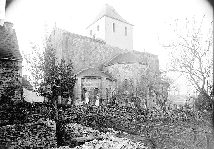 La partie romane de l'église comprend l'abside et le transept sur lequel ouvrent les deux absidioles. L'ensemble est bâti en bel appareil de pierre de taille et voûté : en cul-de-four et berceau en plein-cintre sur les abside et absidioles, en berceau plein-cintre sur les bras du transept et en coupole octogonale sur pendentifs sur la croisée. Seuls les arcs de la croisée ont un tracé brisé. Dans la partie droite du choeur, deux portes dont l'encadrement est en forme de tore épais donnent sur des espaces ménagés entre l'abside et les absidioles, dont la maçonnerie de fermeture, à l'est, est moderne. Un escalier en vis établi à l'angle de la nef et du bras sud du transept permet d'accéder au clocher, qui est moderne. Un second escalier (aujourd'hui inaccessible), à volées droites, est ménagé dans l'épaisseur des murs du bras nord du transept ; il était abondamment éclairé par de véritables fenêtres, dans l'élévation nord, et des jours réservés dans les contreforts, ce qui pourrait laisser supposer qu'il était destiné à une fréquentation autre que simplement utilitaire.