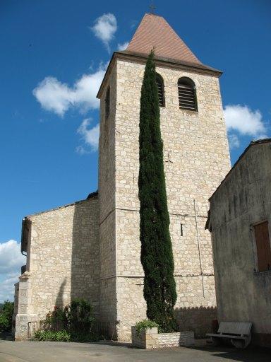 La paroisse dépendait du chapitre de la cathédrale de Cahors ; l'église aurait possédé le corps de saint Cyprien qui aurait été transféré à l'abbaye de Moissac en 1222 (Clary, 1986). De l'édifice antérieur à la guerre de Cent ans, seules subsistent les maçonneries du clocher, datables du 13e ou du 14e siècle, et correspondant peut-être à une tour indépendante. Le reste de l'église a été entièrement reconstruit à la fin du 15e siècle ou au début du 16e siècle. Il est sans doute possible de distinguer plusieurs campagnes, dont les deux principales correspondraient à la nef et au bas-côté nord ; le bas-côté sud, ou peut-être des chapelles, n'a pas été réalisé. L'église a été réparée au cours du 19e siècle, auquel on doit les grandes fenêtres de la nef, et sans doute le dernier niveau de la tour. Les vitraux sont signés et datés Charlemagne à Toulouse, 1869.