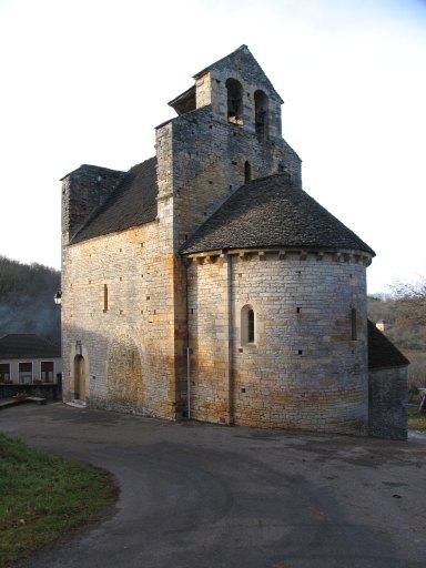 Tout l'édifice est construit avec le même calcaire, soigneusement équarri en moellons ou en plaquettes et disposé en assises très régulières pour les parties médiévales. En dépit d'une assez grande homogénéité, celles-ci montrent des ruptures d'assises et des traces de reprises qui témoignent de phases successives de construction ou de réparations.£Le chevet, dont la corniche est portée par des modillons lisses ou exceptionnellement chargés d'une demi-boule, est constitué d'une abside semi-circulaire voûtée en cul-de-four précédée d'une partie droite couverte d'un berceau brisé ; la fenêtre d'axe, étroite et à arc en plein cintre à l'extérieur, présente un ébrasement à ressaut à l'intérieur, au tracé brisé, et dont le premier rouleau retombe sur des chapiteaux sculptés (les deux autres fenêtres de l'abside étant modernes). L'arc triomphal à double rouleau est également brisé, comme l'arc du portail ouest de la nef, aujourd'hui muré, dont l'angle est souligné par un tore continu sans chapiteau ni imposte. La nef, dépourvue de contreforts ou de pilastres intérieurs, était à l'origine charpentée, avec une toiture à forte pente dont la forme est donnée par les deux pignons est et ouest, percés chacun d'une petite baie à arête vive. La surélévation des deux pignons et les traces d'arrachement que montrent leurs angles sont les seuls vestiges du niveau ajouté à la nef pour servir de refuge.£Il semble bien qu'il faille attribuer au début du 19e siècle toutes les modifications qui ont affecté l'église médiévale. La fermeture du portail ouest et la création du portail sud ont peut-être été imposées par la modification du tracé de la route, qui aurait empêché la construction de la chapelle sud dont seul l'arc d'entrée a été réalisé.