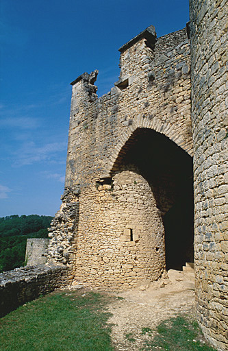 Système défensif limite 15e siècle 16e siècle : fortifications extérieures constituées d'un ensemble de courtines, poivrières et braies, associées à une barbacane au nord séparée de la cour d'honneur par un fossé. Esplanade protégée par une courtine basse formant fausse-braie dominée par le logis flanqué sur le front ouest d'une tour carrée accotée à la salle seigneuriale, encadrée par la grosse tour sur l'angle nord-ouest et par la tour rouge sur l'angle sud-est. Grosse tour de 4 niveaux surmontée de 2 étages de défense, le chemin de ronde inférieur étant supporté par des consoles en pyramide inversée. La cour d'honneur comprenant l'ancienne cuisine, est fermée à l'est par le donjon prolongé au sud en éperon suivant le profil du socle rocheux ; il surplombe les communs à l'est.£ Toit conique couvert en lauzes sur la guette du donjon. 2e niveau de la tour carrée et salles du donjon voutés d'ogives. Salle seigneuriale flanquée d'une tour d'escalier en vis hors-oeuvre. Escalier demi-hors-oeuvre sur l'angle sud-ouest du donjon. Escalier en vis dans-oeuvre dans la Grosse Tour.