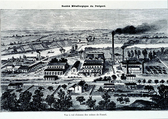 En 1874, la Société Métallurgique du Périgord achète un haut fourneau et une fonderie bâtis en 1847 où l'on construit du matériel ferroviaire. Elle lance de nouvelles fabrications telles que les tuyaux pour travaux d'adduction d'eau, les becs de gaz pour l'équipement des villes et des bâtis de machines-outils. D'importants ateliers de fonderie, d'ajustage et de montage sont bâtis. Pendant la guerre de 1914-1918, la société participe à l'effort national en fabriquant des obus. Après la guerre, l'usine doit se reconvertir. L'atelier d'usinage est créé en 1920. En 1935, des accords sont passés avec la société des Fonderies de Pont-à-Mousson qui modernise l'usine, agrandit l'atelier d'usinage en 1940 et construit le barrage hydroélectrique en 1940-1942. En 1941, la Société prend l'appellation Société Minière et Métallurgique du Périgord. Elle acquiert une importance mondiale dans le domaine des chemises pour gros moteurs marins et se tourne parallèlement vers le secteur de l'automobile. La production mensuelle atteint alors 5000 à 6000 t de fonte brute. De 1945 à 1969 la Société ne cesse de faire de nouveaux investissements tels qu'en 1968 avec la mise en marche de la chaîne d'usinage et d'un 3e haut fourneau. A la fin des années 1960, la capacité des halles de centrifugation est portée à plus de 100000 t par an et le site a été considérablement agrandi. En 1970, l'entreprise devient une filiale de la compagnie Saint-Gobain-Pont-à-Mousson. En 1987 les hauts-fourneaux sont arrêtés. Désormais l'usine de fonderie et usinage de pièces mécaniques travaille essentiellement pour de grands constructeurs automobiles mondiaux. La Société Aquitaine de Fonderie Automobile, créée en 1988, fait partie du groupe Valois.£ Machine soufflante installée en 1870 ; 2 turbines Kaplan dans la centrale hydroélectrique ; cubilots, fours et machines : voir dossier.£ A partir de 1940, la Société fait construire des cités ouvrières, une cantine, une infirmerie, une clinique pédiatrique et des équipements sportifs importants ; d'autres cités ouvrières seront construites en 1952 puis en 1964, ainsi que des logements de contremaîtres. Salariés : 600 employés en 1880, 1200 en 1903, 3000 en 1914, 2200 en 1950, 2700 en 1963, 4000 en 1970 avec les entreprises satellites, 1150 en 1987 et 800 en 1996 dont 638 ouvriers.£ Existence d'un fonds d'archives privées.