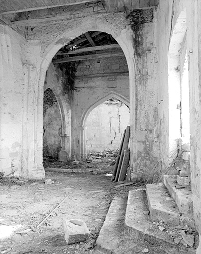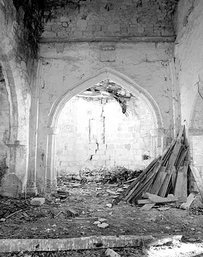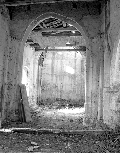 Eglise : nef et chapelle sud avec voûtes d'ogives disparues, choeur en cul-de-four effondré ; logis : logis accolé à l'ouest de l'église, étage de soubassement et étage carré, escalier tournant en façade.