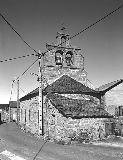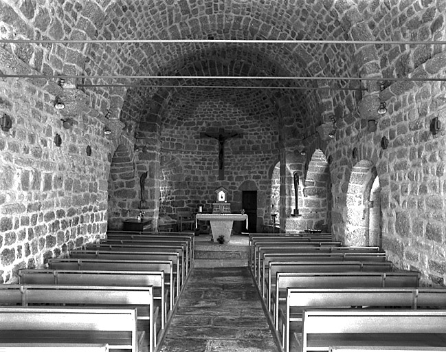 Eglise à nef unique de quatre travées voûtées en berceau plein cintre, qu'élargissent au sud et et au nord de la première travée et de la quatrième travée, au sud de la troisième travée (emplacement de l'ancien portail) des chapelles voûtées en berceaux transversaux. L'abside semi-circulaire est voûtée en cul-de-four. L'élévation ouest est bâtie en pierre de taille. Le toit, à longs pans pour la nef et en croupe ronde pour le chevet, est couvert de schiste et d'ardoise. L'ancien portail situé au sud, présente une clef sculptée d'une tête humaine. Le clocher-mur à trois baies est construit sur l'arc triomphal du choeur