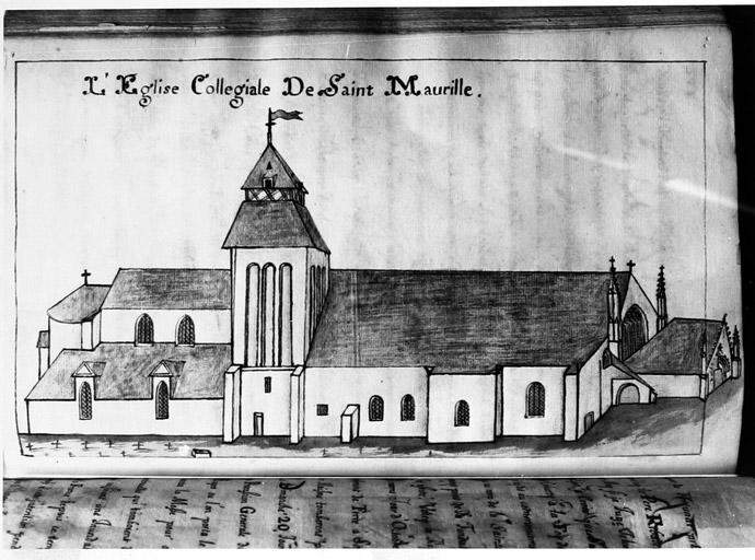 Dédiée primitivement à Notre-Dame, l'église se voit ajouter rapidement le vocable de Saint-Maurille quand le saint évêque y est enterré au milieu du 5e siècle. Une crypte paléochrétienne à quatre pièces, conservant de nombreux tombeaux, sera détruite lors des travaux de nivellement de la place du Ralliement en 1867-1870. Un collège de chanoines y est établi dès l'époque carolingienne. L'église est reconstruite au 11e ou au 12e siècle, voire sur les deux siècles. En 1496, les architectes Guillaume Coué et Mathurin Lecomte sont payés pour des travaux réalisés dans la nef. La façade de l'église et le porche doivent probablement être contemporains, peut-être réalisés par les mêmes maîtres d'oeuvre. Deux chapelles latérales sont édifiées aux alentours de 1528 sur le flanc nord pour servir d'église paroissiale. En 1604, le conseiller du roi Duchesne Goussault est autorisé à faire construire une chapelle sur le côté sud de la nef. De 1714 à 1716, l'architecte Louis Jouin prolonge le choeur de la collégiale pour l'aménager à la romaine. Une nouvelle sacristie est également réalisée à l'issue de ces travaux. La collégiale est démolie à la Révolution, le terrain ainsi dégagé formant l'angle nord-est de la nouvelle place du Ralliement.