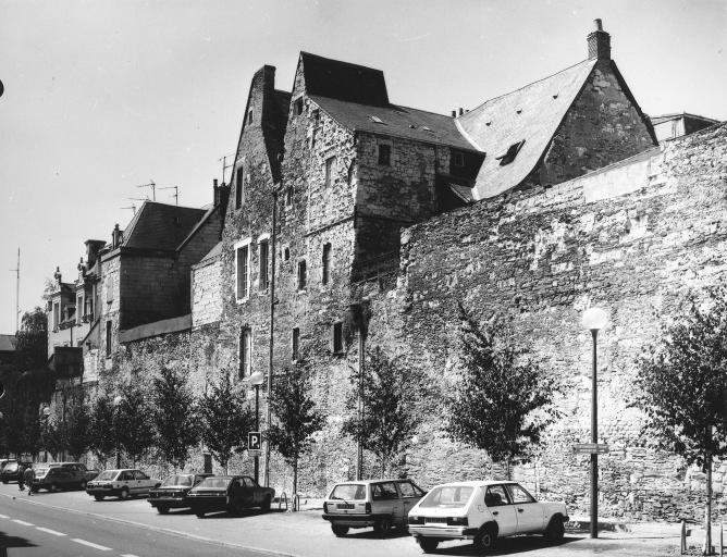 La fortification du Bas-Empire est édifiée à la charnière des 3e et 4e siècles, pendant la période d'insécurité due au délitement progressif de l'Empire romain. Dépeuplée, la ville ouverte du Haut-Empire, Juliomagus, se rétracte dans une enceinte, sur le site défensif de l'oppidum primitif. ££L'histoire de cette enceinte est ensuite celle de ses avatars : aux 10e-12e siècles, la construction du château comtal - chapelle Saint-Laud, salle comtale - entame sa continuité à son extrémité sud-ouest. Puis l'édification de la forteresse royale dans les années 1230 s'effectue au détriment de pans entiers de l'enceinte, dont la porte sud-ouest de Chanzé à l'emplacement actuel de la porte des Champs et du logis du gouverneur. A l'extrémité opposée, la construction du choeur de la cathédrale vers 1250 oblige à sectionner le rempart sur toute la largeur du sanctuaire. Par ailleurs, avec la nouvelle enceinte urbaine créée concomitamment au château, celle du Bas-Empire perd sa vocation défensive et devient une simple clôture de la cité canoniale.££L'habitat surtout intervient dans la détérioration progressive de la fortification. Dès les 11e et 12e siècles, le palais épiscopal adossé à l'enceinte accapare les parties hautes. Des maisons canoniales se construisent de la même façon à l'aplomb de l'enceinte, supprimant le chemin de ronde et écrêtant le sommet de la courtine : on l'observe aujourd'hui encore particulièrement avec les demeures de la rue Donadieu-de-Puycharic et rue Saint-Evroult, dominant la rue Toussaint. Des tours disparaissent en tout ou partie pour la construction de maisons au pied des remparts, les portes sont privatisées. L'épaisseur des murs est attaquée sur la face interne par les caves des demeures canoniales mais surtout sur la face externe par l'habitat commerçant. Vers la Maine, des éboulements au cours des temps, jusqu'au 19e siècle, dus surtout à des extractions d'ardoises à la base du rocher, aboutissent à la destruction complète du rempart entre la maison du grand corbelier (n° 14, rue Donadieu-de-Puycharic) et le château. Les vestiges sont cependant nombreux, à la différence des autres enceintes d'Angers, les parties les plus visibles se situant au château (chapelle Saint-Laud) , rue Toussaint (courtine) , rue Montault (tour de l'Evêché) , rue Baudrière (tour Villebon, dégagée et restaurée en 1891-1893, avec adossement d'une fontaine). £Pour plus de détails sur les vestiges de l'enceinte, voir les compléments d'informations du dossier.
