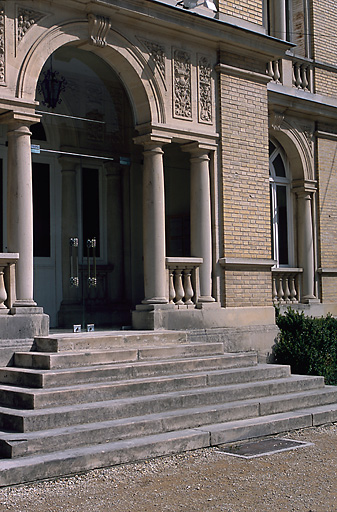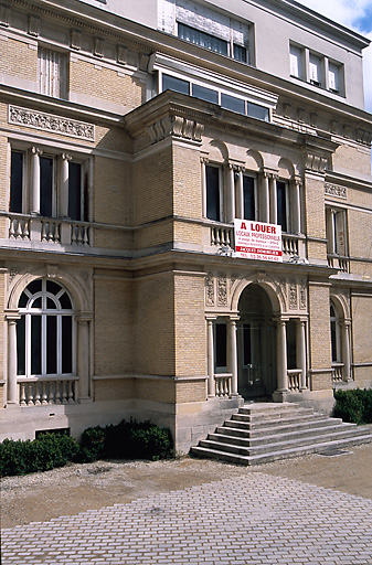 Murs : ossature du logis en pierre de taille calcaire, remplissage brique ; mur de soutènement du fond du jardin en moellons de meulière. Etage : le bâtiment principal comporte 2 étages carrés dont un étage d'attique, surélevé d'un étage en surcroît. Escalier d'entrée extérieur droit à degré rectangulaire.