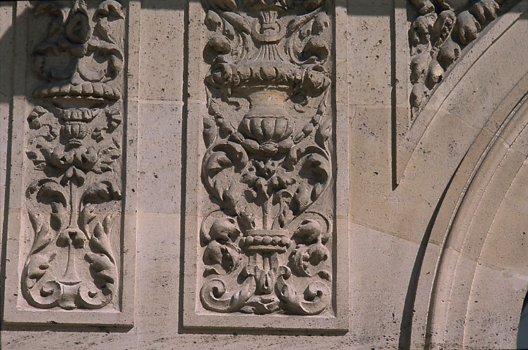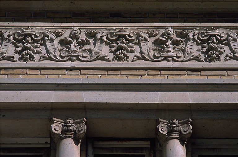 colonne : ordre ionique ; balustre ; rinceau ; denticules ; cercle, enroulement : ornement à forme géométrique