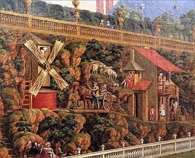 Le Rocher formait une sorte de paysage montagneux fait de blocs de grès et disposé en U, contre le mur de soutènement de la terrasse du château, sur une longueur d'environ 250 mètres. Côté ouest, se trouvait une balustrade avec un balcon soutenu par des colonnes toscanes, pour permettre aux courtisans d'observer l'ensemble et les automates en mouvement. On y voyait des scènes de la vie paysanne sur un fond de roches et d'arbustes et quelques bâtiments, en bois ou en brique, tels que moulin, cabaret, grange ; les automates étaient des figures plates en carton. Ils représentaient des corps de métiers : meunier, berger, cardeuse de chanvre, scieurs en long, maréchal ferrant, rémouleur, charron, blanchisseuse, paysan, musicien, soldat, mais aussi des enfants sur une balançoire et un ermite en prière, ainsi que de nombreux animaux : cheval, chien, chat, mouton, brebis, rat, poules, chèvre, vache, pigeons, et un singe. Sur les extrémités en retour du U, quatre baies étaient creusées, simulant des grottes dont le fond était orné d'une peinture de paysage en trompe l'oeil.