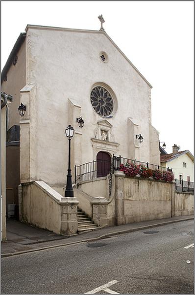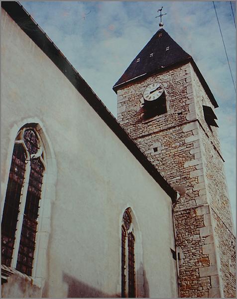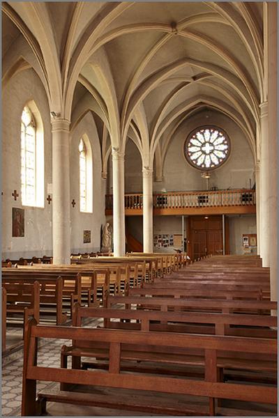 Placée à flanc de colline, léglise orientée est de type halle, comportant trois vaisseaux d'une hauteur quasi identique. La nef compte quatre travées et une plus petite surmontée d'une tribune. Le chur est à trois pans coupés. Le bras sud du transept accueille les fonts baptismaux et mène à la sacristie actuelle. Sur le côté sud de la nef, s'élève une tour carrée massive à trois étages ; elle est couverte d'un toit en pavillon en ardoises et percée sur chaque face d'une baie en arc brisé à deux lancettes surmontées d'un tympan à oculus. Elle renferme un escalier en pierre (recouvert de bois) tournant à retours, une meurtrière et deux petites ouvertures carrées fortement ébrasées. Les voûtes dogives reposent sur six colonnes dans la nef et six colonnes semi engagées sur les murs des bas-côtés. Les nervures des voûtes du 15e siècle sont plus moulurées que celles du 19e siècle (1ère travée) ; celles de la dernière travée du bas-côté nord sont à liernes et tiercerons. La charpente du choeur est caractéristique des charpentes dite à la messine. Les baies du chur, du transept, de la nef se composent de deux lancettes et dune rose. La fenêtre de l'ancienne sacristie sur le bas-côté nord présente un linteau segmentaire délardé à feuillure caractéristique du 18e siècle. La façade est sobrement décorée avec un encadrement de porte sculpté, une niche avec fronton et volutes, abritant une copie du groupe sculpté de La Charité de saint Martin, surmontée d'une rosace et d'une croix. Six contreforts soutiennent lédifice : deux en façade, deux aux angles, deux sur les bas-côtés au niveau de lemplacement de lancien pignon. Lappareillage irrégulier des murs du clocher contraste avec les murs enduits du reste de léglise. La nef est couverte d'un toit à longs pans en tuiles. Dans des bâtiments modernes adjacents, situés sur le côté sud de l'église, donnant sur la rue du chanoine Boulanger, se trouvent la sacristie et l'oratoire Saint Joseph.