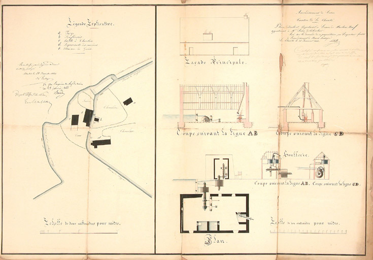 atelier de fabrication ; logement d'ouvriers ; logement de contremaître ; halle ; bief de dérivation ; bâtiment d'eau