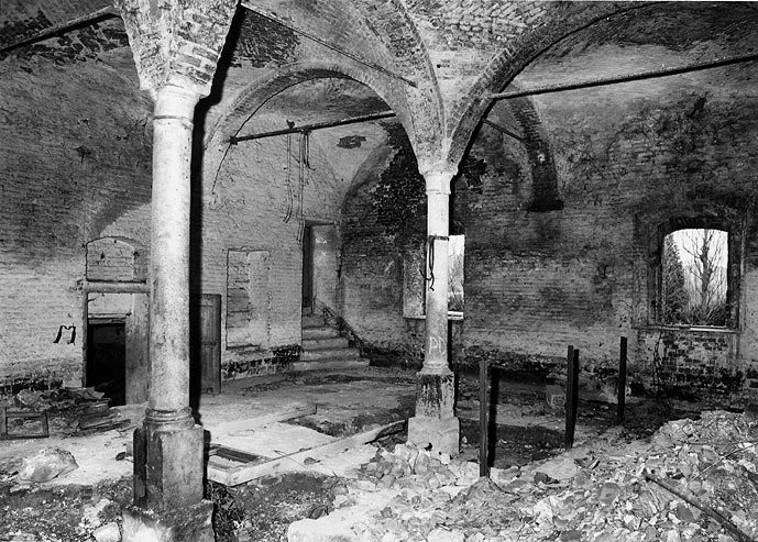 Atelier de fabrication en brique et pierre avec sous-sol couvert d'une voûte en berceau en brique ; entrepôt commercial avec charpente en bois apparente.