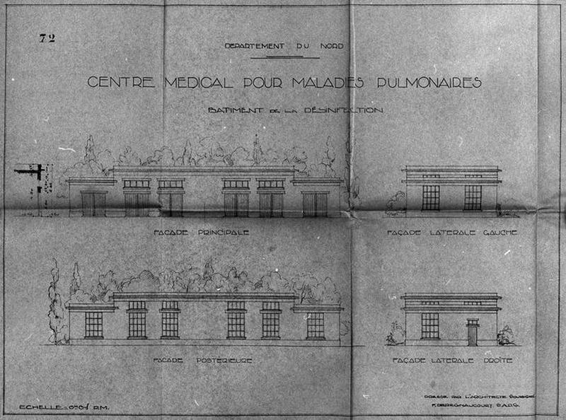 Hôpital-sanatorium projeté en 1929, sous le nom de centre médical pour les maladies pulmonaires, dans le cadre de la création de la future cité hospitalière, sur l'initiative commune de Roger Salengro, député-maire de Lille, d'Oscar Lambret, cancérologue et administrateur, et d'Albert Chatelet, recteur de l'Université de Lille. La notion alors toute nouvelle d'hôpital-santorium était en rapport avec le développement récent de thérapeutiques actives sur la tuberculose pulmonaire ou phtisie, notamment la collapsothérapie, ce qui permettait de sortir du cadre étroit de la simple cure sanatoriale basée sur la triade : repos, cure d'air en chaise longue et suralimentation.£Selon le premier projet dressé par l'architecte Ferdinand Deregnaucourt, l'établissement devait être initialement implanté sur le territoire de la commune de Ronchin. Dans la version définitive du projet, approuvée le 20 octobre 1932, on arrêta que le sanatorium serait établi à la périphérie de la commune de Lille, près de la porte de Béthune, et les travaux de construction furent réalisés entre 1932 et 1936. L'établissement prévu pour une capacité de 450 lits, vit l'ouverture progressive de ses services à partir du 2 novembre 1936, mais l'inauguration officielle fut seulement effectuée le 30 mai 1937 par le ministre de la santé.£A une époque indéterminée, le bâtiment servant au logement du personnel infirmier et celui renfermant réfectoire et salle de réunion, situés du côté est, furent réunis entre eux par un corps de bâtiment intemédiaire et reliés au bâtiment de l'administration par une aile basse. Puis en 1986 furent exécutés des travaux d'épaississement sur certaines sections de la face nord du bâtiment principal, sous la conduite de l'architecte Patrice Dutard, afin d'établir sur toute la longueur de chacun des étages, une double distribution continue de part et d'autre du couloir central. La capacité fut réduite en 1996 à 299 lits et elle se trouve actuellement ramenée à 254 lits.