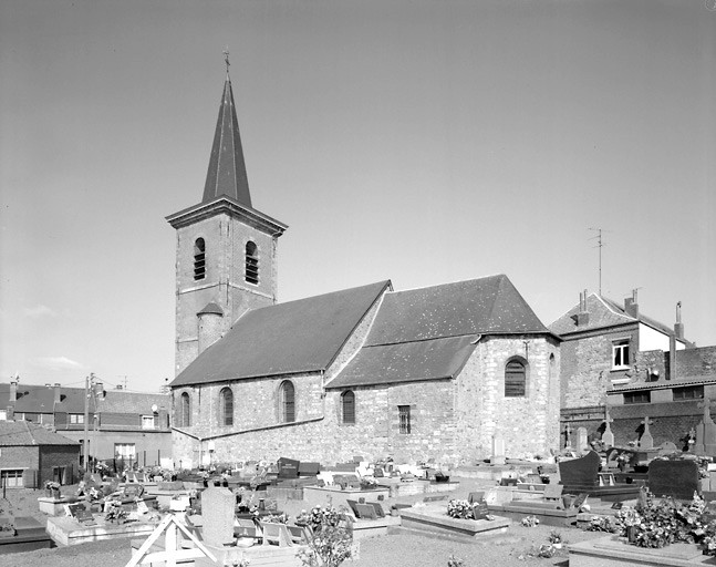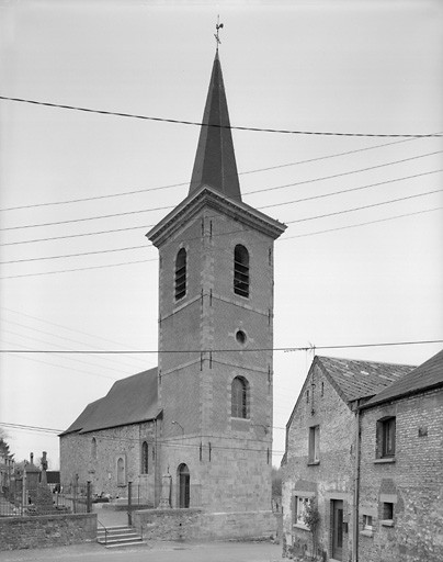 Les travaux historiques mentionnent la réutilisation de la chapelle du château en église. Aucune source ne fait état de la chapelle du château. Le plan du comté de Louvignies de 1768 indique la présence d'un édifice religieux. Les archives de la commune nous apprennent la démolition du clocher et la vente des matériaux en 1783. La reconstruction du clocher se fait entre 1783 et 1788. Les archives de l'abbaye d'Hautmont mentionnent la reconstruction du presbytère et l'entretien du choeur de l'église dans les comptes de 1787. En 1833, l'inscription de la cloche et sa date de réalisation (1687) sont relevées. Des réparations sont effectuées à la toiture en 1829. Le clocher est reconstruit (provisoirement) (?) en 1943-44 par l'architecte Armbruster.