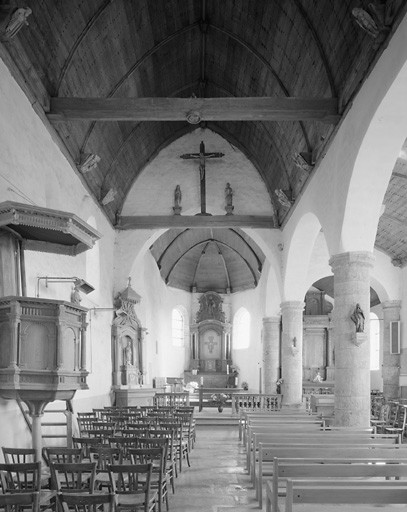 Edifice à deux vaisseaux, terminé par une abside à trois pans. Le vaisseau nord semble être l'ancienne chapelle du château à laquelle un vaisseau et une tour clocher ont été adjoints. Le premier vaisseau est séparé du second par des colonnes de pierre appareillées, qui reçoivent la retombée de la voûte en carène lambrissée à blochets sculptés, représentant 11 apôtres. La poutre de gloire a conservé le crucifix, les statues de saint Jean et la Vierge. Le second vaisseau est largement éclairé et couvert d'une voûte en demi-berceau en charpente lambrissée. La couverture est à deux versants pour la nef et le choeur. La tour-clocher est couverte d'une flèche. L'ensemble est semblableaux flèches des églises reconstruites au 3e quart du 18e siècle dans le bavaisis.