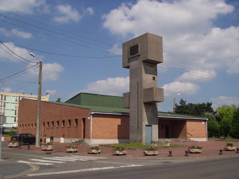 L'édifice en brique de plan rectangulaire abrite un espace réservé au culte et des salles paroissiales. Le choeur se distingue à l'extérieur par l'inversion de l'inclinaison de la toiture. L'édifice est rendu bien visible par un clocher-signal en béton brut de décoffrage.