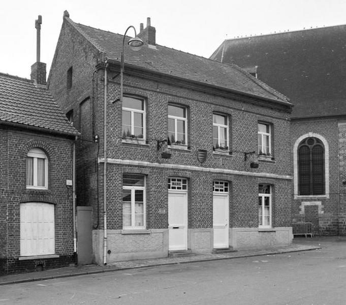 En 1826, le maire fait part au sous-préfet de l'état sanitaire désastreux de la maison commune : le vieil édifice se trouvant sur la place publique menace ruine, la situation défectueuse peut causer chute et accident grave. Sa démolition permettrait d'agrandir la place publique ou à y reconstruire une nouvelle maison dès que la commune sera moins chargée d'imposition.. La même année, le préfet autorise la commune à procéder ... à la mise en vente des matériaux composant [la] maison commune (ditte les Hales) au plus offrant [...], l'adjudicataire sera tenu d'avoir entièrement effectué la démolition au 15 septembre prochain [et] d'avoir évacuer (sic) tous les matériaux....£La vente est adjugée au profit du sieur Bazin pour 305 francs. Un devis-expertise du maçon-entrepreneur Louis Deltombe renseigne succinctement sur les dispositions et l'état de l'édifice : le toit est à deux versants en panne, les murs ont été bâtis avec de mauvaise brique et mauvais mortiere [...] les murs sont pourie, salpettré et lézardé [...] il menace la plus grand ruinne... (sic) (AD Nord, série O330/92). Le 15 avril 1835, l'architecte Dislère, de Douai, réalise un premier devis (AD Nord, série O330/24) d'un édifice en rez-de-chaussée surélevé couvert d'un toit à croupe avec logement de l'instituteur servant occasionnellement de corps de garde, maison commune et école primaire. Chacune des parties possède sa propre entrée, reliées par un vestibule commun. Le projet de la façade est d'inspiration néoclassique : la porte centrale est encadrée de pilastres doriques avec entablement surmonté d'un fronton triangulaire. Les portes latérales possèdent une large imposte vitrée en plein-cintre. Les matériaux prévus sont le grès pour le soubassement, la brique, la brique enduite et le calcaire blanc des carrières d'Hordain.£Le projet ne satisfait ni la Commission départementale des bâtiments civils (avril 1836) , qui le juge trop coûteux, notamment la travée centrale à pilastres, ni les instituteurs qui écrivent au maire que "c'est à peine que nous avons eu connaissance de l'exiguité de la salle en question (29 m2) or comme l'expérience prouve qu'un élève ne peut occuper moins de 56 dm2, le local ne pourra contenir que 51 élèves. Cependant, il est constant que 300 garçons environ fréquentent les écoles en hiver". Le conseil municipal n'est pas satisfait non plus du projet (juillet 1836) : la salle de classe est trop exiguë, le stockage des archives sous le comble constitue une mauvaise solution. Dislère présente un nouveau projet le 31 décembre 1836, prenant en compte les diverses remarques. Un ancien bâtiment est alors détruit et la construction de l'école commence. La réception du chantier a lieu le 1er septembre 1838.£En janvier 1858, l'architecte Lejuste, de Douai, construit une nouvelle classe, celle de 1838, devenue trop petite, étant transformée en chambre, afin d'agrandir le logement de l'instituteur. L'architecte Dosse reçoit les travaux en 1861.£En février 1892, l'architecte Batteur, de Lille, donne un projet pour la construction d'une nouvelle classe ; il reçoit les travaux en décembre 1893.£Une nouvelle école de garçons est construite en 1936 à côté de l'école de filles, actuelle place Roger-Salengro. L'ancienne école est alors réaffectée à divers usages communaux. Le bâtiment de 1838 est restauré au cours du 20e siècle.