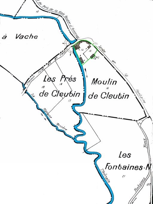 Le moulin à farine de Cleutin est représenté sur un plan de dîmage de 1742. Il appartient alors à l'évêché de Beauvais, qui possède également une chapelle située à proximité et dont l'emplacement a été retrouvé récemment. A la Révolution, l'établissement de meunerie est vendu comme bien national. Il appartient au début du 19e siècle à Jean Mabillote, meunier, qui le cède à Jean Crignon après 1835. Ce dernier fait procéder au règlement du régime des eaux de son établissement le 14 décembre 1855. Jusqu'en 1884, il conserve sa vocation de moulin à blé. Mais après son rachat par Eloi Derogy, opticien, l'ensemble est converti en atelier de polissage de verres optiques utilisant la force hydraulique de la rivière. Finalement, cette pratique du travail du verre s'éteint dans la région vers 1930, et le moulin de Cleutin retrouve sa vocation initiale en 1940. Il est alors entièrement ré-équipé de machines pour la meunerie, en partie conservées. En 1964, M. Toussaint, en est le dernier meunier. Jean-Pierre Toussaint, son fils, architecte à Paris, en hérite en 1979 et aménage les bâtiments pour en faire sa résidence secondaire. L'ensemble est racheté en 1999 par M. Bouteleux, entrepreneur de maçonnerie à Formerie, qui a entrepris la restauration complète des bâtiments. Dans la première moitié du 18e siècle, le moulin n'est visiblement équipé que d'une seule roue hydraulique verticale. Il apparaît toutefois dans le courant du 19e siècle avec un système de deux roues verticales par dessus, dont les dimensions ne sont pas connues. Le système hydraulique, réglementé en 1855, se compose d'un déversoir de 4 m de long muni d'un vannage de décharge d'1, 27 m de large. Le coursier maçonnée est large 1, 20 m. Le beffroi, abritant les engrenages de transmission, dont le grand volant, ainsi que les deux paires de meules avec leur coffrage et certains éléments de trémies ont été conservés sur place.
