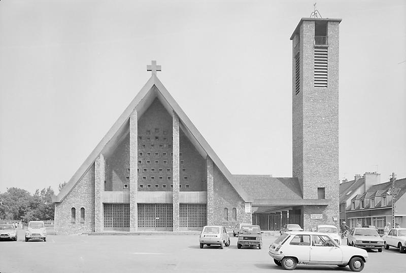 L'église reconstruite forme avec la chapelle un plan en L fermé par un cloître assurant la liaison entre le clocher, implanté hors oeuvre, et le bâtiment principal. L'église est élevée en pierre et couverte de deux longs pans à forte pente, percés de lucarnes, en tuile plate. A l'intérieur, l'unique vaisseau est couvert par une voûte en béton ovoïdale évoquant la coque d'un navire renversé. Les vitraux sont dus à Gabriel Loire et à Henry Lhotellier. Le chemin de croix est l'oeuvre de Claude Gruer. Le Christ glorieux est l'oeuvre de Nicole Hémard.