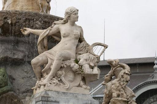 La fontaine monumentale s'élève sur la place du marché de Tarbes, Place du Marcadieu, à l'est de la halle métallique, sur un emmarchement de granite. Elle se tient sur un soubassement de marbre gris clair, de plan carré, aux angles tréflés, animé de légères courbes. Sa composition très pyramidale doit se lire du haut vers le bas : elle évoque en effet le thème des sources pyrénéennes qui donnent naissance aux nestes et torrents pour irriguer les principales vallées qui ouvrent sur la plaine de Tarbes. Au sommet se tient le groupe sculpté, en bronze, de l'Aurore accompagnée par un izard bondissant. L'Aurore est représentée en jeune nymphe s'apprêtant, dans l'élan de la marche, à jeter des fleurs autour d'elle. Ce premier groupe est porté par une pyramide rocheuse en pierre calcaire où s'agrippent putti et figures d'hommes et de femmes nus, symbolisant les torrents (Nestes et Gaves). Ceux-ci semblent se disputer avec violence la faveur de déverser dans les directions souhaitées l'eau jaillissant de lourdes jarres. Sous ce deuxième groupe sculpté, se succèdent deux bassins circulaires en marbre gris, au diamètre croissant, reliés par une pile rocheuse. Le premier bassin, ourlé de concrétions, réceptionne l'eau jaillie des jarres et la redistribue en laissant tomber son trop-plein dans le bassin inférieur. Sur les faces de la pile centrale, la roche sombre ménage des cavités où se tiennent, sculptés, en bronze, des animaux sauvages symboles des montagnes (aigle, ours, loup...). Le bassin inférieur, d'un diamètre nettement supérieur, est ourlé d'une margelle en forme d'épais boudin d'où retombent de lourdes concrétions en festons. Aux quatre points cardinaux figurent quatre groupes sculptés sur des piédestaux carrés de marbre gris ornés de concrétions retombantes, comme sur le deuxième bassin. Ils symbolisent la plaine de Tarbes et les trois grandes vallées (Bagnères, Aure et Argelès) se reposant au pied de la montagne, représentées sous la forme de jeunes nymphes accompagnées de leurs attributs respectifs (Bagnères avec la lyre des poètes, Aure avec le mouton et le boeuf de la vie agricole, Argelès avec le bouquetin des hautes montagnes, et Tarbes avec le cheval et le canon). La volonté dramatisante de la composition générale exprime un contraste entre la nature sauvage des parties hautes et la nature contrôlée et apaisée des parties basses. Ce contraste est également souligné par l'effet de polychromie entre les marbres, gris clair et gris foncé, le bronze (aujourd'hui vert) et l'ivoire de la pierre calcaire.