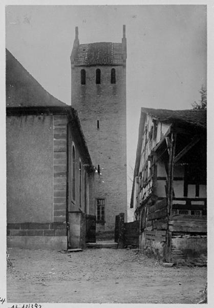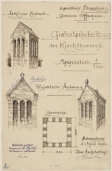 Le clocher de l'église d'Offenheim, seul vestige de l'église primitive, pourrait dater du 15e siècle. L'actuelle nef et le choeur, disposés perpendiculairement à l'ancien bâtiment, ont été construits en 1789.