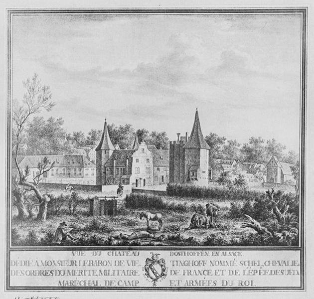Le château fort primitif, appartenant au type " Wasserschloss ", date du 12e ou du 13e siècle. Une famille de burgrave d'Osthoffen est citée au milieu du 13e siècle. La première mention certaine date de 1351. Au début du 15e siècle, le château est endommagé lors du conflit avec l'évêque de Strasbourg. L'aspect actuel des bâtiments appartient en grande partie au 16e siècle, époque à laquelle Osthoffen passe aux mains de la famille de Seebach qui transforment l'ancien château fort en résidence, en conservant les fondations anciennes. Au cours du 18e siècle, la famille Zuckmantel y effectue des travaux de moindre importance : percement de fenêtres, aménagements intérieurs, construction des dépendances, installation de la fontaine. Au cours de la Révolution, la tour sud-est aurait été mutilée. En 1817, la famille du baron d'Empire de Grouvel achète la propriété. Des travaux y sont effectués vers 1860 : aménagements intérieurs, girouette datée 1866, et surtout reconstruction totale de la tour sud-est, travaux aux communs. Les armoiries de cette famille se retrouvent en plusieurs endroits, notamment sur les monuments sépulcraux du petit cimetière, datant pour la plupart des années 1870. Un incendie récent a endommagé les communs.