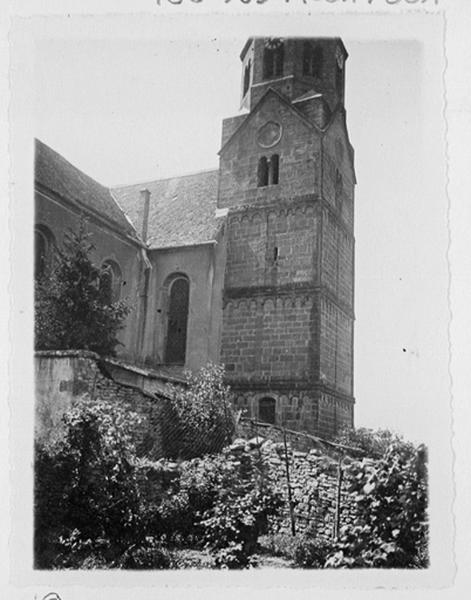 Clocher en pierre de taille, orné de lésènes et d'une frise d'arceaux sur chaque niveau. Le premier niveau est percé d'une baie en plein cintre murée à l'est, d'une porte en arc segmentaire au sud ; au nord, porte murée (ancienne sacristie détruite ?). Sur la face sud, au 1er niveau, un linteau en bâtière, sculpté d'une croix inscrite dans un cercle (remploi ou ancienne porte murée ?) , un relief représentant un buste à double queue de poisson flanqué de deux têtes isolées, et à la base de deux arceaux, une figure humaine (casquée ?). Le deuxième niveau est aveugle, le troisième est percé d'un jour au sud. Le quatrième niveau roman, percé de baies jumelées en plein cintre, avec colonne monolithe centrale et tailloir, présente des pignons ajourés d'une rose datant du 19e siècle. Le dernier niveau, octogonal, est percé de baies jumelées en plein cintre dans chaque pan. De part et d'autre de la tour, la partie inférieure de l'ancienne nef est conservée (côté est) , avec des pierres à bossage à gauche et un motif carré recoupé de quarts de cercle (ancienne ouverture ?) à droite. La nef, perpendiculaire à la nef primitive ouvre sur le transept, qui est un simple élargissement du vaisseau central et sur le choeur par un arc triomphal en plein cintre. Choeur à pans coupés. Porte d'entrée de la nef en plein cintre, auvent moderne. Ouvertures en plein cintre et roses avec quadrilobes. A l'intérieur, le rez-de-chaussée de la tour n'est pas voûté ; il comporte au niveau du sol une armoire eucharistique avec arc en accolade orné de crochets, surmonté d'un fleuron ; grille en fer forgé (elle n'a pas pu être étudiée ni photographiée car entièrement dissimulée derrière la chaudière de l'église). Vestiges de peintures murales très abîmées et pas entièrement dégagées. Trace de l'ancien arc triomphal en plein cintre sur le mur ouest.