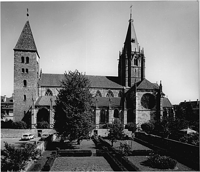 L'église est orientée, appareillée en grès, entièrement voûtée d'ogives (arcs-boutants sous les toits des bas-côtés, contreforts extérieurs à pinacles). Le vaisseau central et les bas-côtés ont 7 travées avec grandes arcades en arc brisé. Le bas-côté sud est doublé, les 3 travées occidentales correspondant au porche d'entrée. A la place du 2e bas-côté nord se situe le cloître. L'accès à la tribune en grès, sur double arcade, se fait par une tourelle d'escalier hors-oeuvre. La croisée du transept comporte une coupole octogonale nervurée, sur trompes, et une coursière. Des 4 tourelles de la tour, celle du N-E abrite un escalier. Les bras du transept, à 2 travées chacun, s'ouvrent vers l'est sur une chapelle et sont ajourés, au nord et au sud, par une rose. Le choeur, avec abside à pans coupés, donne accès, au nord, à un escalier en vis desservant la tour de croisée et, au sud, à l'ancienne sacristie. Celle-ci est ouverte sur la chapelle St-Willibrord et commande l'accès à l'étage qui se fait par une tourelle d'escalier. La tour occidentale, décentrée, en petit appareil irrégulier, comporte des baies géminées, une porte d'origine, à l'est, et une porte gothique, au nord. Les charpentes de la flèche et de la partie ouest du vaisseau central sont médiévales.