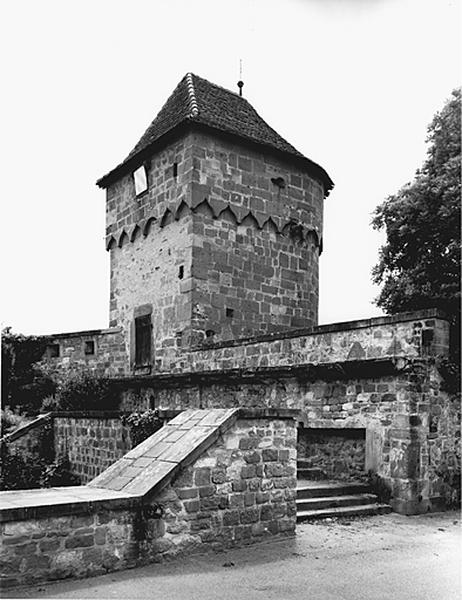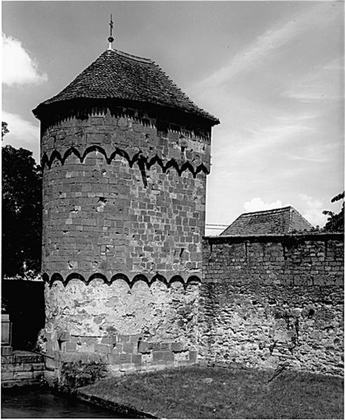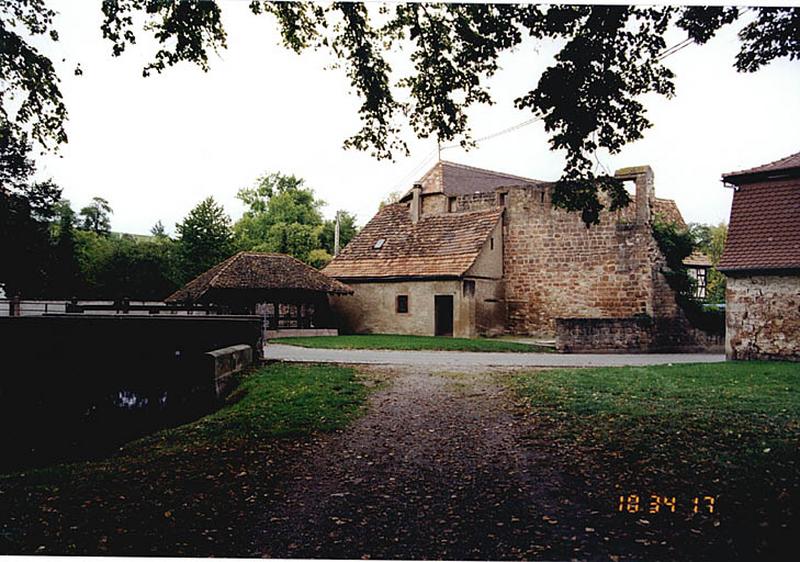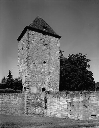 Wissembourg est qualifiée d'oppidum, en 1179, et de civitatis depuis le milieu du 13e siècle. La fortification urbaine remonte donc au moins au milieu du 13e siècle. La construction de nouveaux murs est attestée en 1265. L'enceinte fut complétée au 14e siècle par une braie. Le faubourg du Bannacker (à l'est) , fut fortifié en 1311, celui du Bruch (à l'ouest) en 1380. En 1673, Louis XIV, fit démolir la braie et partiellement l'enceinte. En 1706, Wissembourg fut intégrée dans les Lignes de la Lauter. En 1746, Louis de Cormontaigne, ingénieur militaire, entreprit de renforcer la fortification, de surhausser les murs, de construire des remparts, des batardeaux et des ouvrages extérieurs. Des casernes, achevées en 1764, furent érigées au Bannacker. En 1805, les fortifications furent restaurées et complétées. Une partie des murs fut détruite en 1840-1841. La fortification fut déclassée en 1867. Au N-O, à la sortie du Bruch, se situait la porte de Bitche (Obertor). Elle est attestée en 1467, fut partiellement reconstruite en 1527 et fut déplacée au 17e siècle. La porte S-O dite Schartenpforte, de 1452 (?) , donnait accès depuis la ville au Bruch. Au N-O, y donnait accès, la porte Pfister (détruite en 1807). Elle portait une inscription de 1445. La tour qui la surmontait datait, selon Hertzog, de 1478. Au nord, la porte Saint-Etienne, attestée en 1454, condamnée en 1518 ou 1528, enterrée dans le rempart au 18e siècle a été redécouverte lors de fouilles, en 1987. La porte de Spire (porte du milieu, entre la ville et le Bannacker) , datait de 1260. Elle servit de prison militaire et civile, s'écroula en 1898 et fut démolie. Au S-E, la porte de Haguenau, avec corps de garde de 1769, fut remaniée en 1726 et vers 1850 et fut détruite en 1882. La porte de Landau (porte basse, à l'est du Bannacker) , endommagée en 1870, fut détruite peu après. La tour Schneckenturm (détruite vers 1909) près du moulin des franciscains, était voûtée et avait un escalier en vis. La tour Hausgenossen, dans le Bruch, à l'ouest de la porte des eaux de 1748, porte la date 1481 sur une baie, elle servait de poudrière au 18e siècle. La tour N-E, dite Poudrière, date du 13e siècle. La tour Schartenturm, fait partie de l'enceinte fortifiée de l'abbaye.