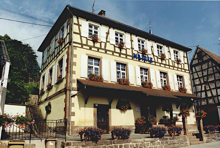Ecole et mairie construites de 1825 à 1827 : en 1825 les travaux sont entrepris sous la direction de Jean Charles Dufau, délégué par l'architecte du département, réalisés par l'entrepreneur Georges Neubrand de Soultz-sous-Forêt. La date 1825 est gravée sur le linteau de la porte principale. Au milieu de l'année 1826, les travaux sont repris par le charpentier Charles Kugler de Langensoultzbach sous la direction de l'architecte de la ville de Wissembourg, Joseph Lambert. Le métrage de réception définitif date du 12 septembre 1827. Marques de tâcheron : M, H. Actuellement le bâtiment est occupé par la seule mairie, une nouvelle école ayant été construite à l'arrière de l'église (fin du 20e siècle). Bâtiment rénové, auvent neuf.