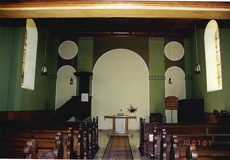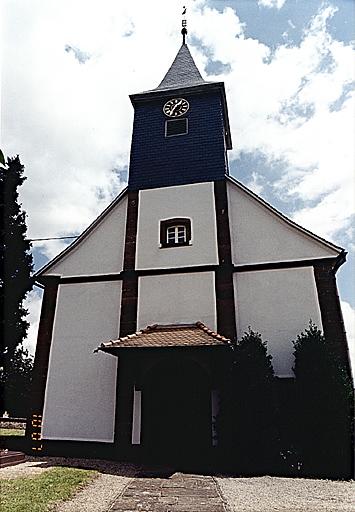 L'église est orientée et d'une grande simplicité. Elle comporte une nef rectangulaire et une tour-clocher dans-oeuvre reposant, dans la nef, sur deux monumentales colonnes en grès. Les socles, les chaînes, le cordon de façade et les chambranles des baies, en arc surbaissé (pour la porte occidentale) et en plein cintre (pour les fenêtres de la nef) sont en grès et portent des marques de tâcherons (H, L, A) que l'on trouve aussi sur les deux colonnes. La partie de la tour émergeant du toit, est essentée en ardoises. Le plafond de la nef est lambrissé. Dans le comble se voient les 3 murs en pan de bois de la tour. La charpente comporte 5 fermes, 3 poinçons et une semelle.