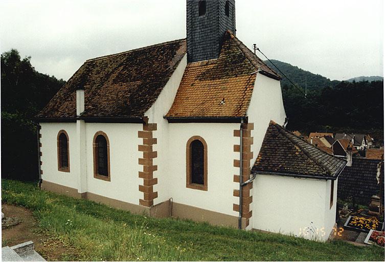 Petite église orientée dominant le reste du village. Nef rectangulaire à 2 travées et choeur carré avec demi-croupe, campanile et sacristie axiale. Fenêtres en plein cintre. Marques de tâcheron : I, sur toutes les chaînes d'angles. Arc triomphal en plein cintre, tribune en équerre. Cimetière autour de l'église.