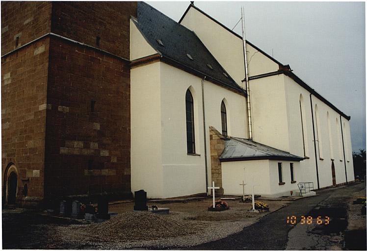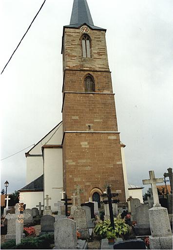 Eglise actuelle occidentée. Tour entièrement appareillée en grès. Dans la partie ancienne, trous de levage, 3 niveaux de jours en archère et un niveau avec baies en arc brisé, celle vers l'ouest conservant des vestiges de réseau. Le dernier niveau, néo-gothique, porte la date 1876. Au rez-de-chaussée, porte occidentale, de style gothique tardif avec armes du village (le maillet) encadrant une 2e porte ancienne, plus petite, en remploi. A droite, bénitier extérieur, en grès. A l'intérieur, voûte sur croisée d'ogives (en sifflet) avec clé évidée et traces de peintures ; vers l'est, trace d'un arc en plein cintre. Le choeur conserve un contrefort côté sud, un linteau daté 1742 sur le mur ouest, côté nord, 4 baies à réseau gothique tardif ; à l'intérieur, deux pans coupés cachent les angles occidentaux ; derrière l'autel accès à la tour ; côté sud, porte datée 1934, côté nord, porte datée 1508 (le 5 est toujours pris pour un 4) , vers la sacristie nord. Dans celle-ci sont remployées en façade, provenant de l'ancienne église, des pierres taillées, une porte de style gothique tardif et 4 clés de voûte ornées d'écus et d'un décor végétal. La nef, néo-gothique, comporte 5 travées de baies et une porte centrale côté nord à pinâcles ; dans le socle, pierres en remploi avec marques de tâcheron. Sous la tribune sont réutilisées des consoles sculptées de têtes avec abaques polygonales moulurées.