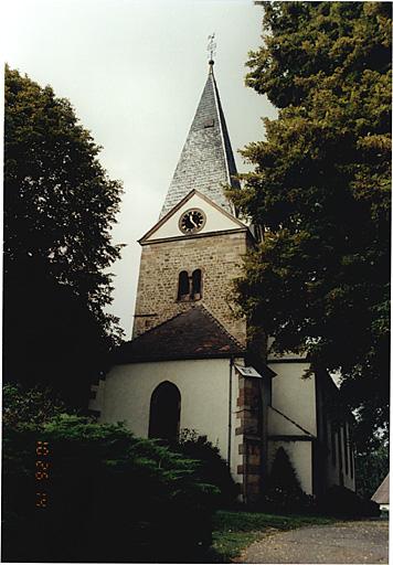 Le vocable, Saint-Laurent, de l'église est attesté depuis le milieu du 15e siècle. La Réforme luthérienne fut introduite en 1530 et remplacée par le calvinisme en 1588. Le simultaneum avec le culte catholique date de 1729, le règlement officiel gérant le trimultaneum (calviniste, catholique et luthérien) date de 1785. Depuis 1899, les catholiques ont leur propre église. Du bâtiment primitif subsiste la tour-choeur datant du dernier quart du 11e ou du 12e siècle. La trace du toit de la nef romane est encore visible sur la face ouest de la tour, dans le comble de la nef. Au 14e ou 15e siècle, le choeur au rez-de-chaussée de la tour fut remplacé par un choeur à chevet plat, accolé à l'est de la tour ; une nouvelle nef fut construite dont subsiste également la trace du toit, sur la face ouest de la tour. En 1846 la nef gothique fut remplacée par l'actuelle ; la voûte du choeur fut remplacée par un plafond (?) , le toit (en bâtière ?) de la tour fut remplacé par une flèche. Kraus signalait, dans le dernier tiers du 19e siècle, des vestiges de peintures murales du 16e siècle (dont une sainte Barbe). Elles étaient certainement antérieures à 1530 ; il n'en subsiste plus de vestige visible depuis 1939.