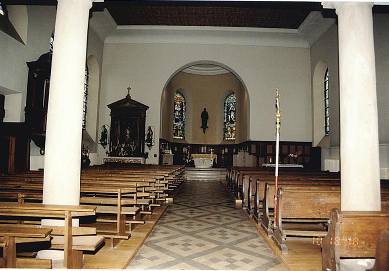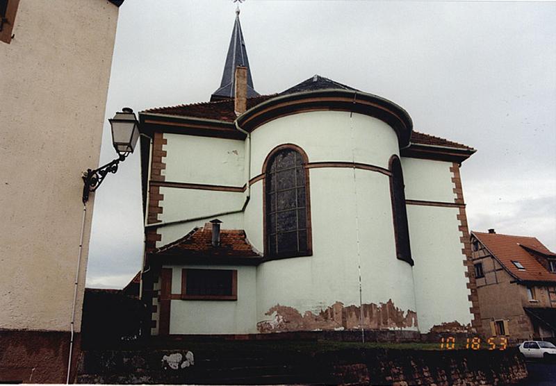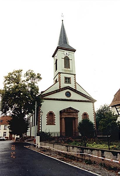Eglise approximativement occidentée avec tour-porche dans-oeuvre, à flèche octogonale ; façade à fronton et niches (vides) , porte encadrée de colonnes soutenant un entablement à fronton ; choeur demi-circulaire ; fenêtres en plein cintre ; chaînes d'angle harpées ; marques de tâcherons : H, C, V, M, W. Dans la nef, plafonnée, un autel secondaire catholique et, en pendant, un autel protestant, mobile ; dans le choeur, plafonné, lambris et autel face au peuple ; tribune d'orgue sur colonnes en grès.