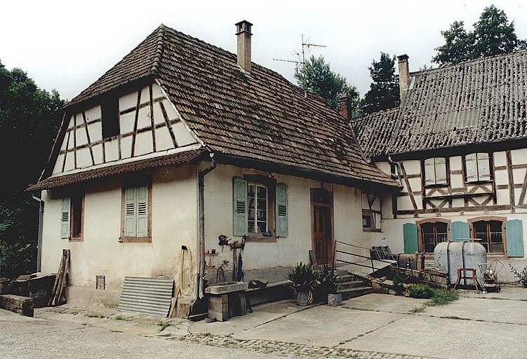 Logis en maçonnerie, en rez-de-chaussée, avec sous-sol partiel. Le moulin lui est accolé ; il comprend un rez-de-chaussée (une partie en contrebas) en maçonnerie et un étage en pan de bois. Linteaux des fenêtres en arc segmentaire ; losanges dans les allèges. Grande lucarne avec poulie. Grange et étable en maçonnerie et pan de bois (remaniées). Buanderie en bordure du canal. Puits avec margelle de grès.